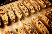 Method: 1. Combine 3/4 cup sugar and eggs in mixer. Mix on medium speed. scrape bowl often. until thick and pale yellow in color. 2. Add oil, orange juice, orange peel, and vanilla, beat 1-2 min. 3. Combine flour, walnuts, baking powder, and salt, gradually add to egg mixture. mix on low 1-2 minutes. 4. Stir in cherries by hand. 5. Turn dough onto lightly floured surface (dough will be soft and sticky). Sprinkle dough lightly with flour, knead in. With floured hands shape into 2- 8x2 logs. 6. Place 3-4 inches apart on sheet tray, flatten tops slightly. 7. Combine egg white and water, brush top of logs. Sprinkle with sugar. 8. Bake in pre-heated oven 25-30 minutes or until light brown and firm to touch. Let cool on sheet tray for 15 minutes. 9. Reduce oven temp to 300 degrees. Cut logs diagonally into 1/2 inch slices with serrated knife. Arrange slices cut side down on sheet tray. 10. Bake for 8-10 minutes, turn slices bake 8-10 minutes or until golden brown. Cool. 20-25 slices per log; yeild 2 logs |