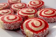 Sift together the flour, salt and baking powder and set aside. Cream butter and sugar together in another large bowl. Add egg, vanilla, milk, and peppermint extract, and beat until incorporated. Gradually add the dry mixture, beating until combined. Remove half of the mixture from the bowl. Add red food coloring, beating until fully combined. You may have to knead the colored dough a bit to get it mixed thoroughly. On a sheet of waxed paper, roll out dough to form a large rectangle, about 1/4-inch thick. Repeat this step with the other half of uncolored dough with no food coloring. Now very carefully, slide the red dough on top of the white dough and slide the parchment paper out. Trim edges if uneven and patch if necessary. Roll dough into a log, creating a swirl effect. NOTE: do not worry if the dough starts to tear a little when you are rolling it. This is normal. Simply mend it with your fingers as you go along. Now place a generous amount of sprinkes in a shallow dish and roll the cookie dough log firmly over the sprinkles until they stick and its covered. Wrap tightly with saran wrap and place the dough back in the refrigerator and let chill for 2 hours. Preheat oven to 375 degrees F. Slice the dough into 1/2-inch slices and place on a parchment lined sheet tray about 1-inch apart. Bake fo2 10-15 minuets depending on how thick you sliced the cookies. |