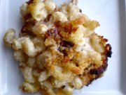Preheat oven to 375°. To roast garlic: Slice ½ inch off the top of the entire head of garlic. Drizzle with olive oil and sprinkle with salt and pepper. Wrap garlic head tightly in a square of heavy foil and roast until tender — about 45 minutes. Remove garlic pulp by squeezing garlic head. Smash cloves with a fork to form a paste. Cook pasta according to package directions. Cook bacon completely. Drain on paper towels. Reserve 1 tablespoon of bacon fat. Crumble bacon when cool. To make topping: Combine breadcrumbs, crumbled bacon, Parmigiano Reggiano cheese, and 2 tablespoons of melted butter. Set aside. Sauté shallots over low heat in reserved bacon fat for one minute. Add remaining 6 tablespoons of butter and continue to sauté shallots in butter and bacon fat until translucent. Add flour and continue to cook for 1-2 minutes. Increase heat to medium. Stirring constantly with a whisk, add milk and roasted garlic paste. Cook until sauce is thickened (coats the back of a spoon). Remove sauce from heat then add salt, pepper, nutmeg, Gruyere and Cheddar cheeses. Taste and adjust salt and pepper if necessary. Stir in cooked pasta. Pour into baking dish. Sprinkle topping to cover entire top. Cover with foil and bake 15 minutes. Remove foil and continue baking until sauce is bubbly and topping is browned. Enjoy! |