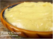 3. Remove from heat and immediately pour into a 2" 1/2 pan that has been sanitized. Sprinkle some sugar over the surface of the custard, allow the cream to cool for a few minutes and then cover with saran wrap. |